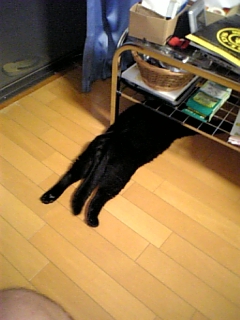 そんなこんなで帰国し、その日のうちにクロ助を実家へと迎えにいったのだが、忙しすぎてクロ助のお土産も買うヒマもなく、その事に気付いたクロ助は、なにやら言葉少なげでゲージにシゲシゲと入り、すんなりと帰宅した後は、テーブルの下に腹這いに寝転がってずーっと動かず、何だがすねている様子でした。